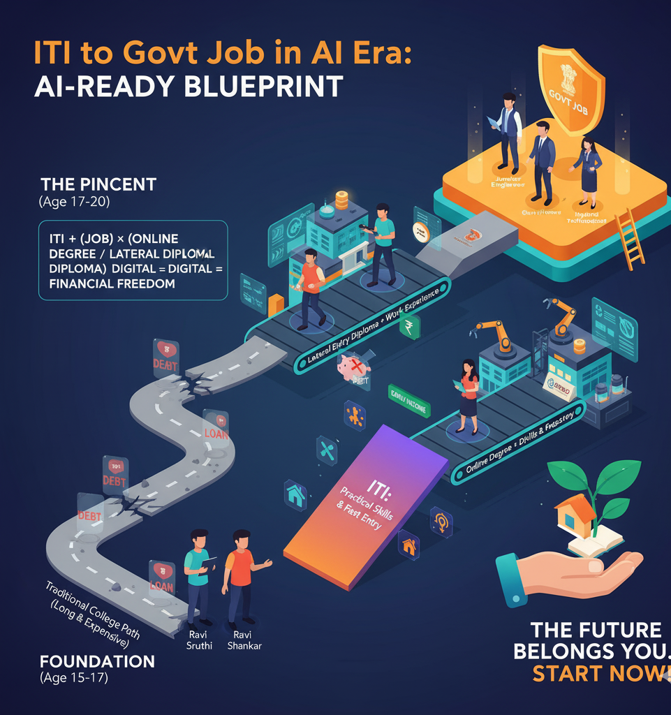 At the very top of our visual, by their early 20s, Ravi, Sruthi, and Shankar stand tall and confident. They are no longer just ITI graduates but certified Junior Engineers, Government Officers, and Hybrid Technocrats—possessing the trifecta of a stable job, critical experience, and advanced qualifications.